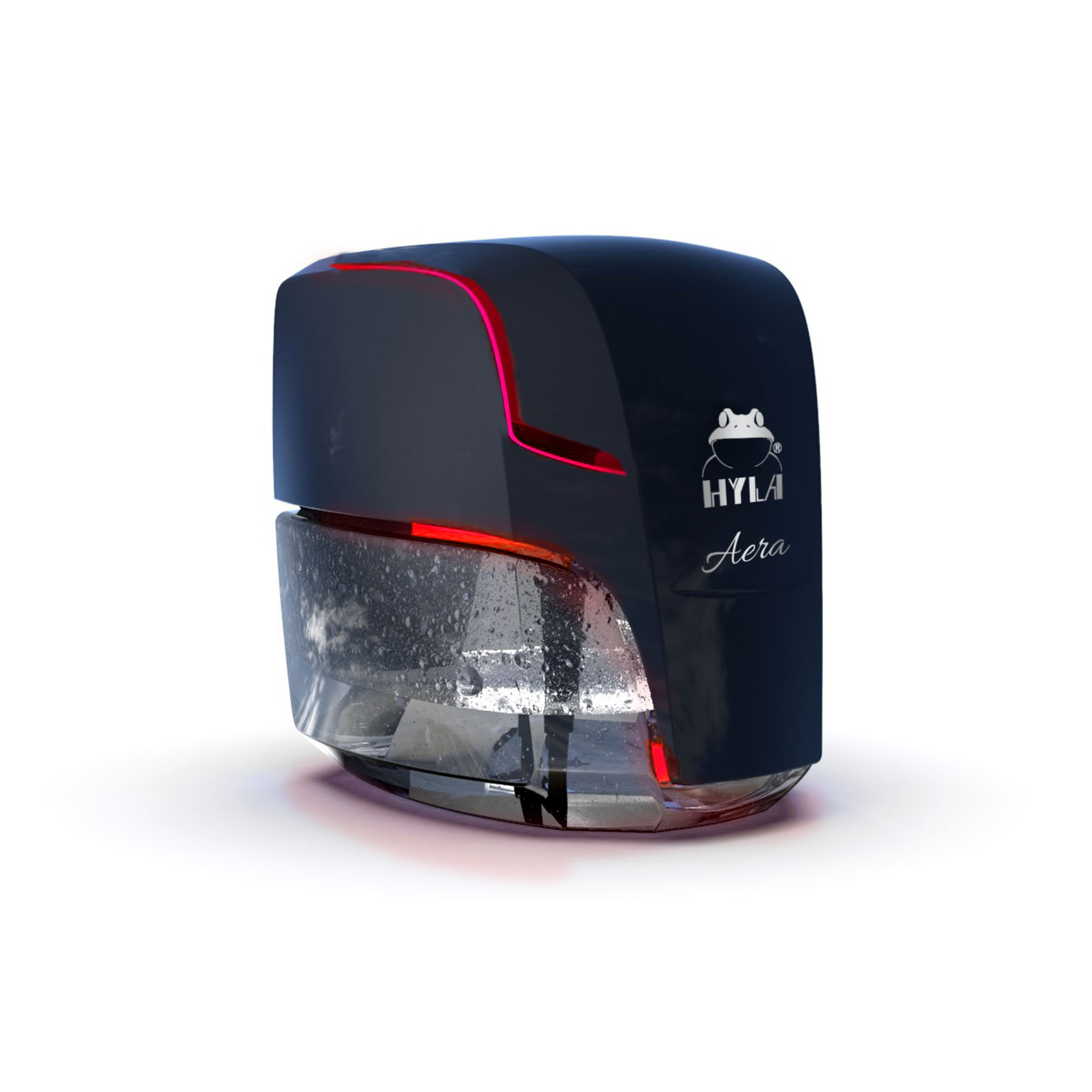 Der AERA Lufterfrischer besteht aus nur zwei Teilen: der Motor-Einheit mit LED-Lichtern und dem Wasserbehälter. Das glänzende schwarze Cover und das zentral platzierte HYLA-Logo machen deutlich, dass es sich um ein neues Produkt von HYLA handelt. Die Neuerung des AERA Lufterfrischers ist die HYLA AERA App, mit der das Gerät über das Smartphone gesteuert werden kann. Die App ermöglicht es dem Nutzer das Gerät zu Aktivieren und aus Millionen von Farben zu wählen oder seinen eigenen Lichteffekt zu kreieren.